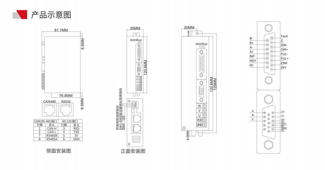 ※ 控制方式:外部脉冲(单端/差分)、CAN总线、RS485总线、RS232通讯控制、IO控制等,支持位 置、速度和力矩模式